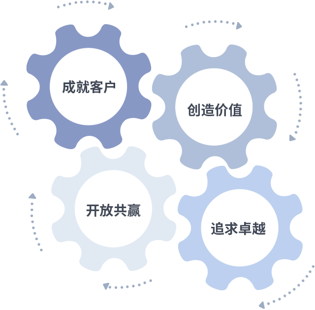 成就客户是一切决策的出发点,创造价值是衡量所有工作的标准,追求卓越是新城平台做事做人的态度,开放共赢是新城平台的格局也是最终的结果。价值观的齿轮环环相扣,推动着组织里的每个人不断向前。